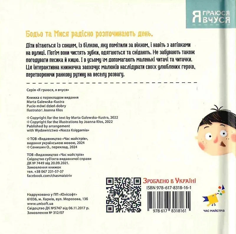 Разом із Бодьо та його подругою Мисею маленькі читачі вирушають у теплу ранкову пригоду. Герої прокидаються, вітаються із сонечком, чистять зубки, одягаються та снідають. Книжка створена у формі гри-наслідування — дитина спостерігає за героями й охоче повторює корисні щоденні ритуали. Завдяки простому тексту, яскравим ілюстраціям і знайомим ситуаціям малюк швидко включається у процес читання та навчання. Це чудове видання допомагає сформувати позитивне ставлення до ранкових справ, розвиває мовлення, уяву та самостійність.
