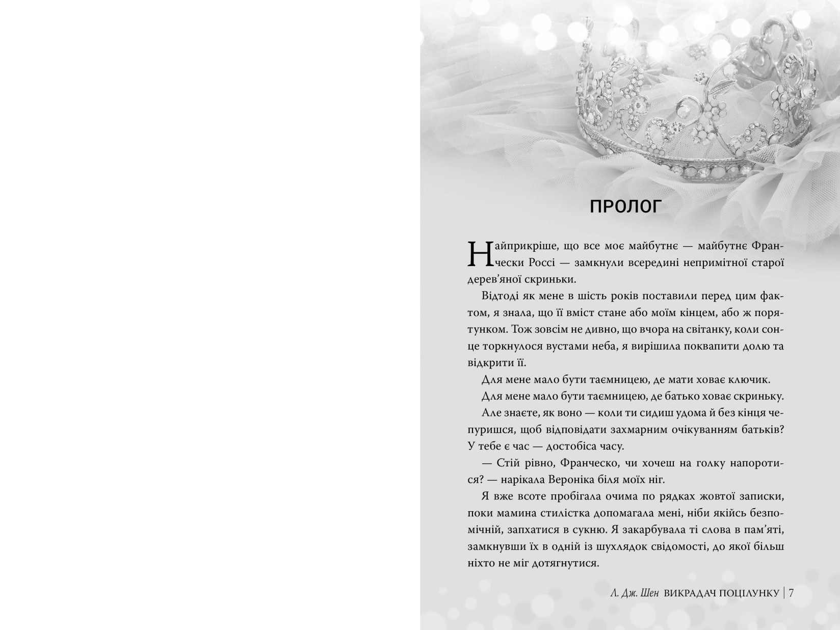 «Викрадач поцілунку» — пристрасний і драматичний роман Л. Дж. Шен про кохання, яке починається зі змови й боротьби за владу. Франческа Россі завжди жила за правилами своєї впливової родини. Її життя було розписане наперед, а майбутнє мало бути таким, як вирішили інші. Але все змінюється, коли на її шляху з’являється сенатор Вольф Кітон — холодний, владний і небезпечний чоловік. Він вирішує одружитися з Франческою, навіть якщо для цього доведеться змусити її погодитися. Те, що починається як політична угода і боротьба характерів, поступово перетворюється на складну гру почуттів. Франческа намагається зберегти свою свободу, але водночас усе сильніше відчуває тяжіння до чоловіка, якому не довіряє. Це історія про владу, пристрасть, вибір і кохання, яке народжується всупереч обставинам.
