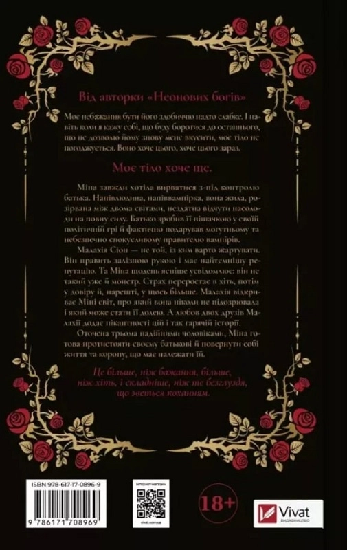 Троє звабливих чоловіків-вампірів І одна королева, що править ними усіма До видання входить три романи серії Bloodline Vampires: «Жертва», «Спадкоємиця» й «Королева» Моє небажання бути його здобиччю надто слабке. І навіть коли я кажу собі, що буду боротися до останнього, що не дозволю йому знову мене вкусити, моє тіло не погоджується. Воно хоче цього, хоче цього зараз. Моє тіло хоче ще. Міна завжди хотіла вирватися з-під контролю батька. Напівлюдина, напіввампірка, вона жила, розірвана між двома світами, нездатна відчути насолоди на повну силу. Батько зробив її пішачкою у своїй політичній грі й фактично подарував могутньому та небезпечно спокусливому правителю вампірів. Малахія Сіон — не той, із ким варто жартувати. Він править залізною рукою і має найтемнішу репутацію. Та Міна щодень ясніше усвідомлює: він не такий уже й монстр. Страх переростає в хіть, потім у довіру й, нарешті, у щось більше. Малахія відкриває Міні світ, про який вона ніколи не підозрювала і який може стати її долею. А любов двох друзів Малахії додає пікантності цій і так гарячій історії. Оточена трьома надійними чоловіками, Міна готова протистояти своєму батькові й повернути собі життя та корону, що має належати їй. Це більше, ніж бажання, більше, ніж хіть, і складніше, ніж те безглуздя, що зветься коханням. Попередження 18+: Книга містить детальний опис інтимних сцен із сексуальною експериментацією, епізоди насильства та отруєння наркотичними речовинами.