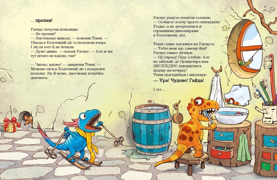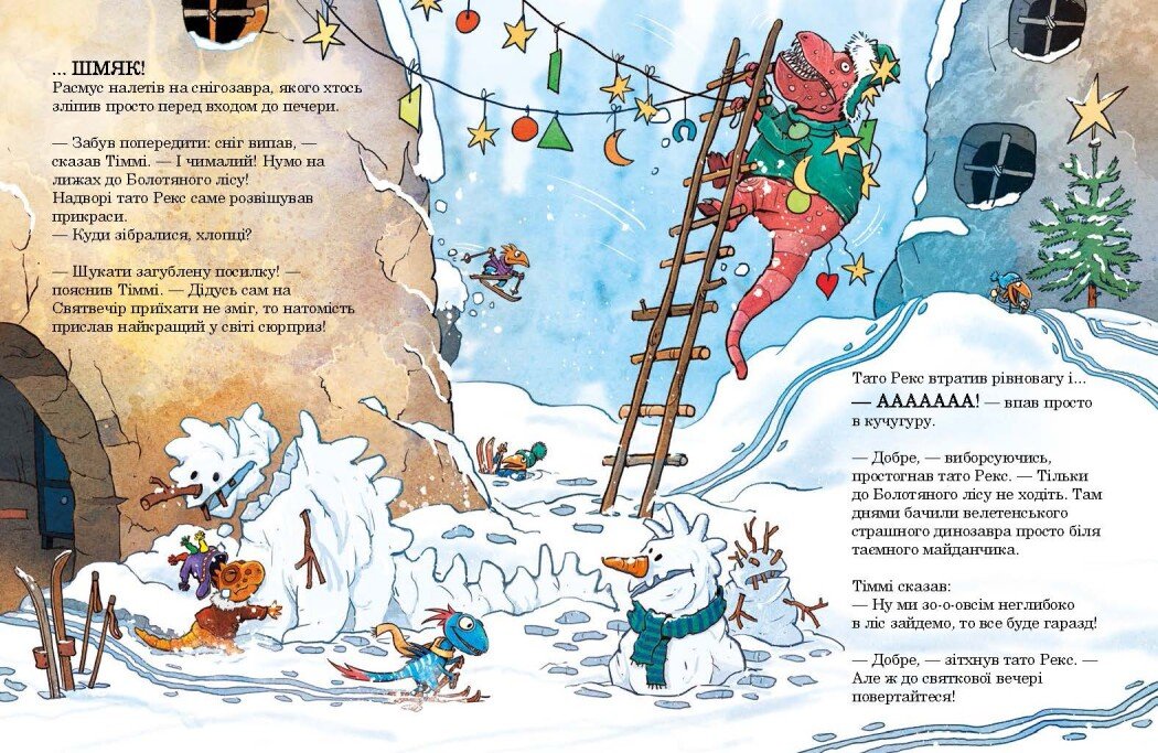 Попереду на них чекають небезпеки, загадкові сліди та навіть чутки про велетенського хижого динозавра. Це тепла зимова історія про дружбу, сміливість і віру в диво, яка створює святковий настрій і захоплює дітей яскравими ілюстраціями та пригодницьким сюжетом.