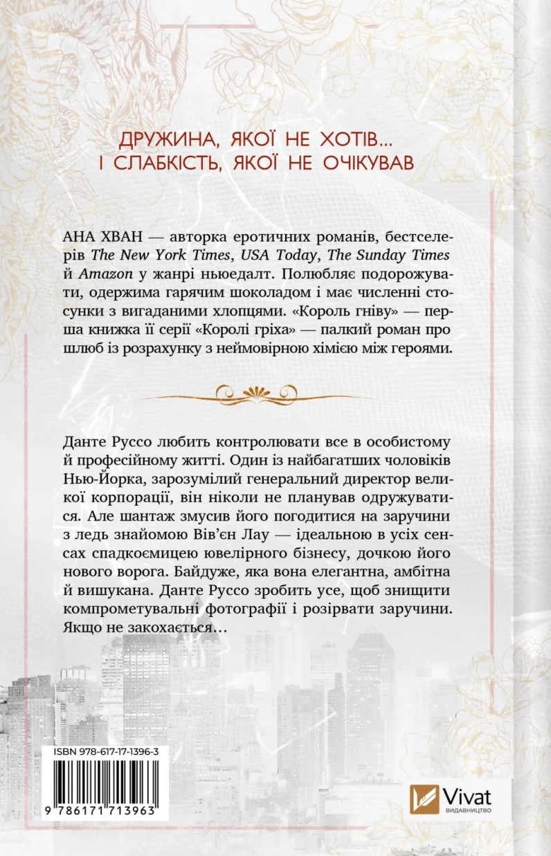 Вона була моєю Полярною зіркою, найяскравішою коштовністю на небосхилі Перша частина серії «Королі гріха» Best of #BookTok Бестселер The New York Times Мастрід для поціновувачів тропів «шлюб за домовленістю», «вимушена близькість» і «від ворогів до коханців» Подвійна POV: оповідь ведуть Вів’єн і Данте 18+. Книга містить відверті сексуальні сцени та ненормативну лексику Данте Руссо любить контролювати все в особистому й професійному житті. Один із найбагатших чоловіків Нью-Йорка, зарозумілий генеральний директор великої корпорації, він ніколи не планував одружуватися. Але шантаж змусив його погодитися на заручини з ледь знайомою Вів’єн Лау — ідеальною в усіх сенсах спадкоємицею ювелірного бізнесу, дочкою його нового ворога. Байдуже, яка вона елегантна, амбітна й вишукана. Данте Руссо зробить усе, щоб знищити компрометувальні фотографії і розірвати заручини. Якщо не закохається…