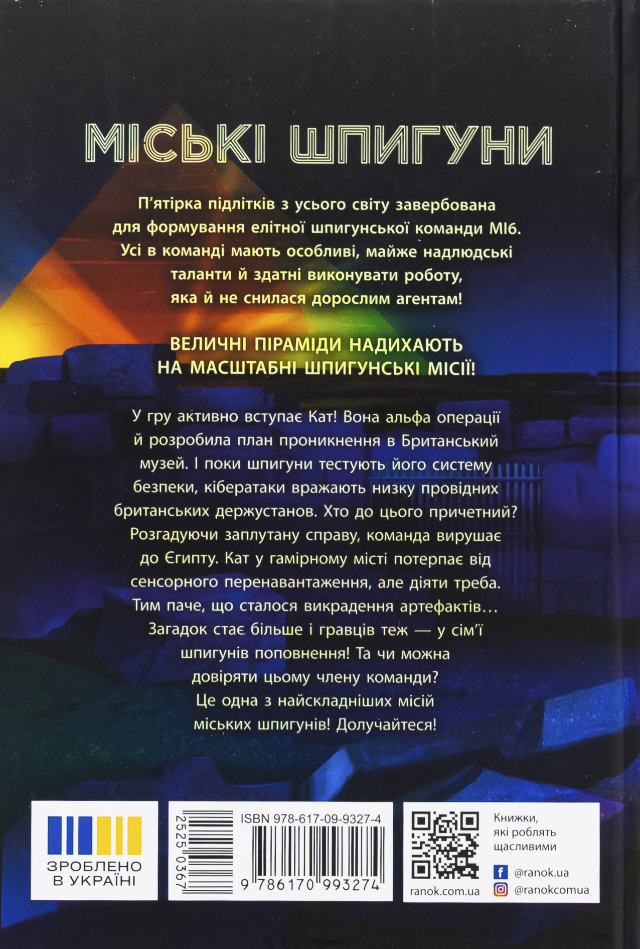 У книзі «Міські шпигуни. Місто мертвих» команда підлітків-агентів отримує одну з найскладніших місій. Цього разу в центрі подій — Кат, яка очолює операцію з проникнення до Британського музею. Поки шпигуни тестують його систему безпеки, кіберзлочинці здійснюють серію атак на провідні британські державні установи. Розслідуючи загадкову справу, команда вирушає до Єгипту — у легендарне «місто мертвих», де стикається з новими викликами, небезпеками та таємницями стародавніх цивілізацій. Ситуація ускладнюється, коли стає відомо про викрадення цінних артефактів, а підозри падають навіть на членів команди. Юним шпигунам доведеться перевірити свою довіру одне до одного, проявити кмітливість і сміливість, щоб розкрити правду та виконати місію. Це захоплива історія про дружбу, ризик, командну роботу й пригоди, які тримають у напрузі до останньої сторінки.