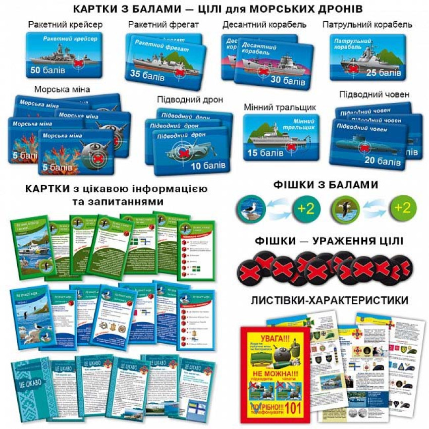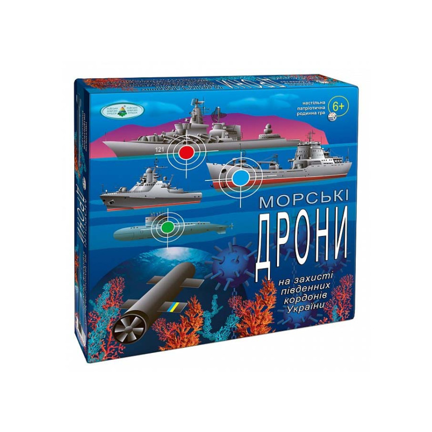 Ворожий флот у складі одного крейсера, двох ракетних фрегатів, двох десантних кораблів, одного патрульного корабля, одного мінного тральщика, трьох підводних човнів, а також трьох підводних дронів зайшов в акваторію сусідньої мирної країни та зачинив шлях торговим судам. Підступний ворог встановив п'ять морських мін. Щоб звільнити торговий шлях, на завдання відправили чотири морські дрони нашої країни з назвами «Малюк», «Магура», «Марічка» та «Толока». Їм потрібно пройти через рифи, підводні міни та знищити ворожий флот. За кожну уражену ціль гравці отримують бали. На початку гри кожен гравець обирає собі фішку з морським дроном. Інші фішки та картки сортують та кладуть поруч з ігровим полем. Гра починається з кружечків «Старт». Якщо дрон потрапляє на кораловий риф (білий кружечок) — гравець робить крок назад. Якщо на міну (червоний кружечок) — повертається на базу (кружечок «Старт»), оскільки під час вибуху дрон отримує пошкодження. Якщо дрон вдруге потрапляє на міну — гравець вибуває з гри. Дрон може потрапити на зелений або блакитний кружечок, тоді гравець читає картки й відповідає на запитання в них. Подолавши шлях з коралових рифів та підводних мін, впоравшись з відповідями на запитання карток, гравець потрапляє на жовтий кружечок — місце, з якого дрон буде знищувати ворожий флот. В наступному ході, гравець більше не робить кроків вперед, а кидає кубик, щоб дізнатися, яку ціль буде вражати його морський дрон. Гра закінчується, коли морські дрони знищать весь ворожий флот. Після цього гравці підраховують бали на фішках та на картках з балами. Перемагає той, хто набере більшу кількість балів. Якщо сума балів буде однаковою у декількох гравців, тоді перемагає той, хто першим закінчив гру. Кількість гравців — 2–4. Тривалість гри — 15–20 хвилин. Ідея, дизайн та малюнки: Олена РИБАКОВА Консультанти: Департамент гуманітарного забезпечення Міністерства оборони України КОМПЛЕКТАЦІЯ: 1. Правила гри 2. Ігрове поле (40 х 60 см) – 1 3. Кубик – 1 4. Морські дрони – 4 5. Підставки для Дронів – 4 6. Картки з балами – 18 7. Фішки «хрест» – 18 8. Картки «На землі, в повітрі і на морі» – 7 9. Фішки з балами «На землі, в повітрі і на морі» – 6 10. Картки «Захист моря» – 7 11. Фішки з балами «Захист моря» – 6 12. Картки «Це цікаво» – 6 13. Листівки-характеристики