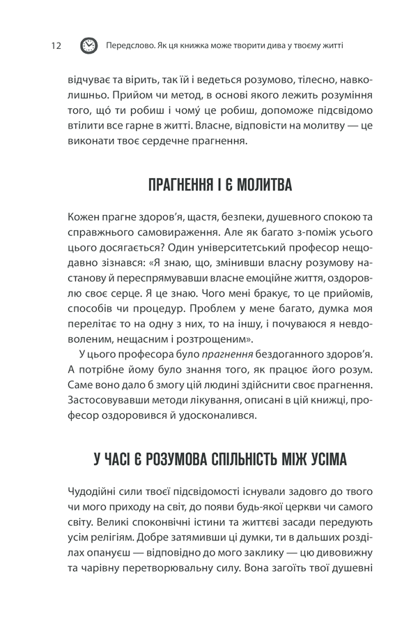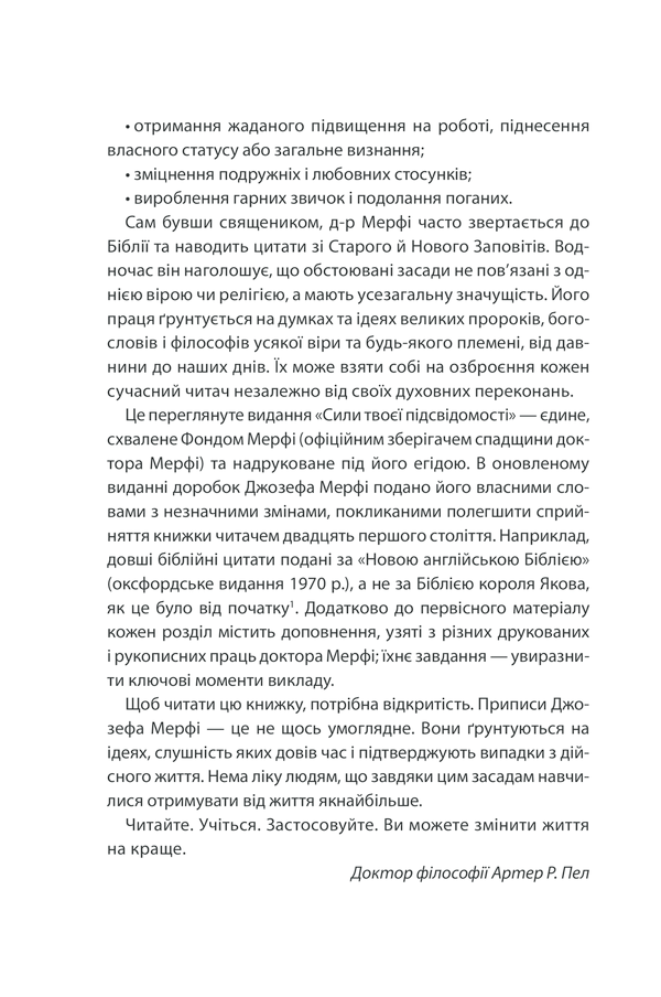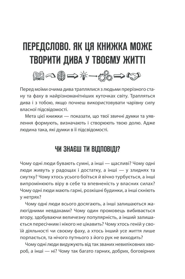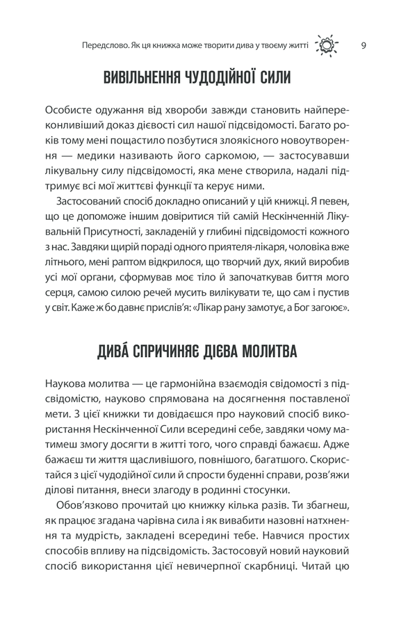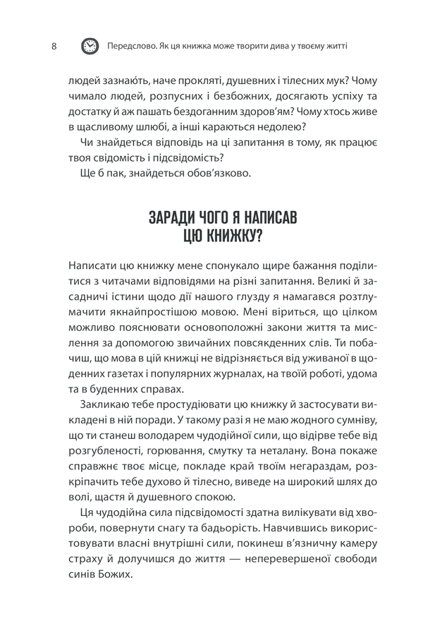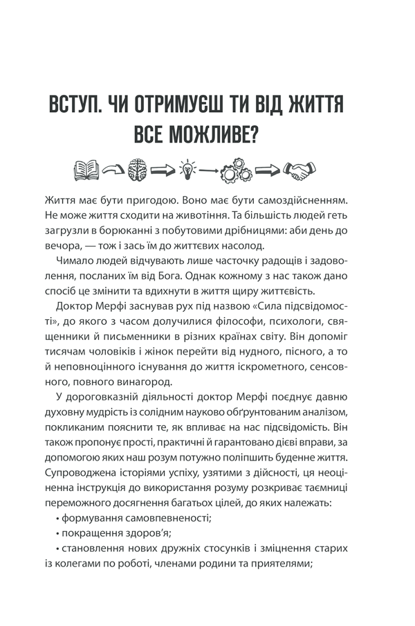 Джозеф Мерфі розкриває принципи роботи підсвідомості та показує, як внутрішні переконання впливають на успіх, здоров’я, стосунки та фінансове благополуччя. Автор переконує: змінюючи свої думки, людина здатна змінити свою реальність.