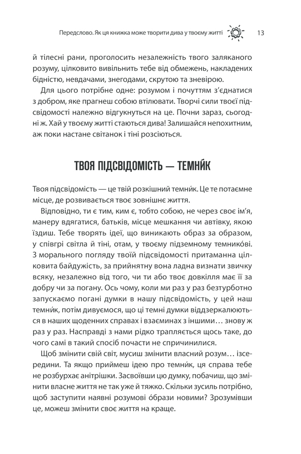 У книзі поєднані психологічні знання, духовні ідеї та практичні поради. Через приклади й прості техніки читач дізнається, як позбутися негативних установок, сформувати нові звички та навчитися керувати власним життям.