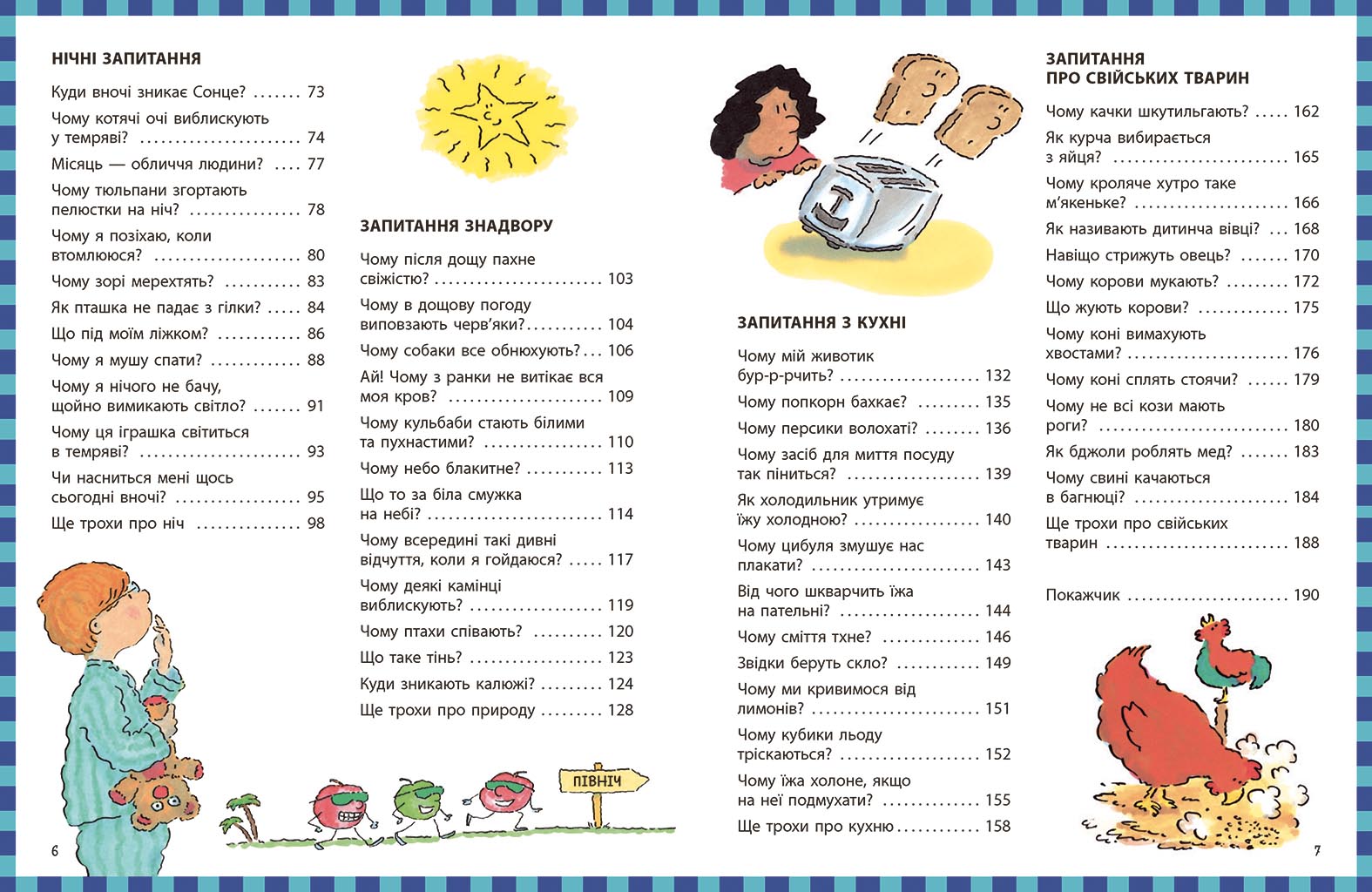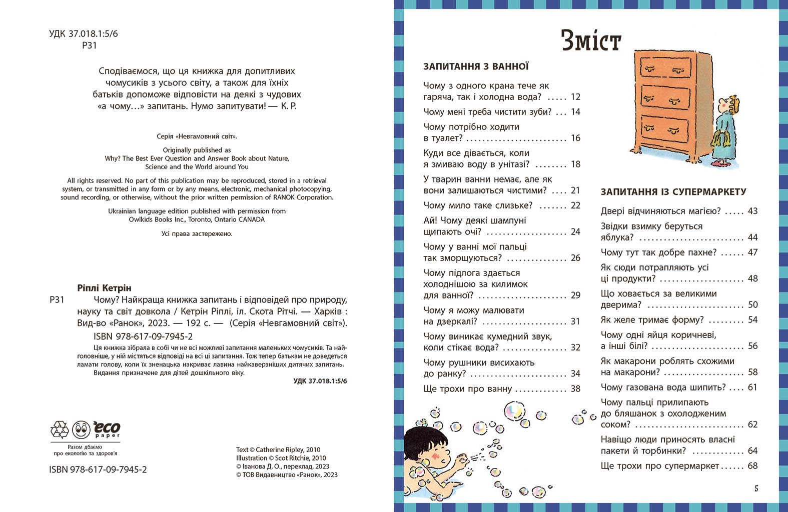 Діти щодня ставлять безліч запитань, і більшість із них починається зі слова «чому?». Ця книжка створена саме для маленьких дослідників, які хочуть краще зрозуміти світ довкола. На сторінках видання зібрано доступні та цікаві відповіді на найрізноманітніші запитання про природу, тварин, явища довкілля, науку та повсякденне життя. Завдяки яскравим ілюстраціям, кумедним прикладам і простим поясненням дитина легко засвоює нові знання та розвиває допитливість. Книга допомагає формувати логічне мислення, розширює кругозір і перетворює навчання на захопливу гру. Вона стане чудовим вибором для спільного читання з батьками або для перших самостійних відкриттів маленького читача.